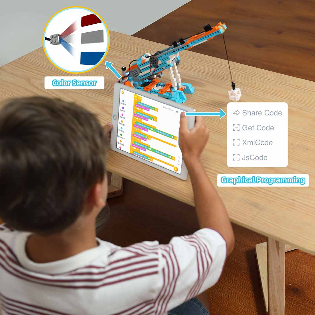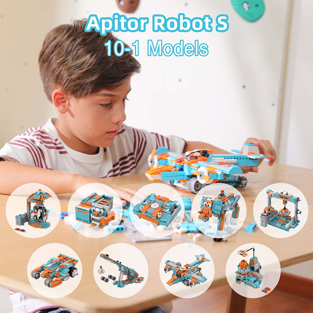 Con la aplicación gratuita Apitor Kit, los niños pueden explorar las luces, los sonidos, los sensores y los movimientos del robot. Además de estas funciones básicas, la interfaz de programación más popular del mundo y los cursos de codificación gratuitos pueden expandir la imaginación de los niños para crear más formas de jugar.